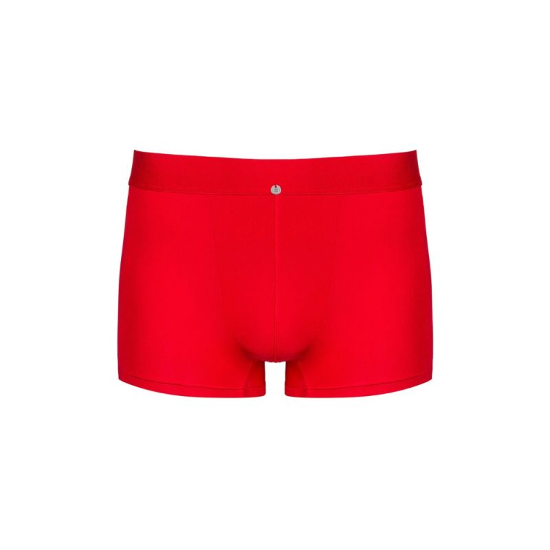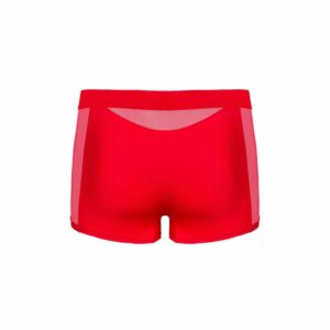 Rote Pants Boldero von Obsessive mit transparenten Einsätzen jeweils seitlich und hinten. Rundum weich und elastisch für hohen Tragekomfort. Bequemes Bundgummi mit kleinem Metall-Element vorne.