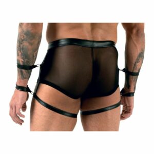 Schwarze Pants aus transparentem Powernet in Kombination mit edlem Mattlook. Elastisch und anschmiegsam für hohen Tragekomfort. Beutel mit praktisch erotischen Druckknöpfen zum Öffnen. Jeweils seitlich an zwei Ringen mit Hand-/Armfesselriemen – einer an der Pants, einer an dem Oberschenkelriemen. Abnehmbare Fesselriemen jeweils mit verstellbarem Klettverschluss.