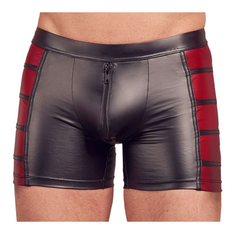 Schwarze Pants von NEK im trendigen Mattlook mit roten Einsätzen jeweils seitlich. Vorne mit unterlegtem Reißverschluss, der sich für praktische und erotische Zwecke schnell öffnen lässt. Fantastisch elastisch für hervorragenden Tragekomfort.