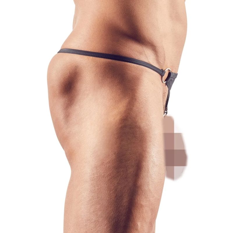 Schwarzer Ministring mit abknöpfbarem Penisring (Ø 5 cm). Weiche Mikrofaser mit schmalen, bezogenen Stretchbändern. 85% Polyamid, 15% Elasthan.