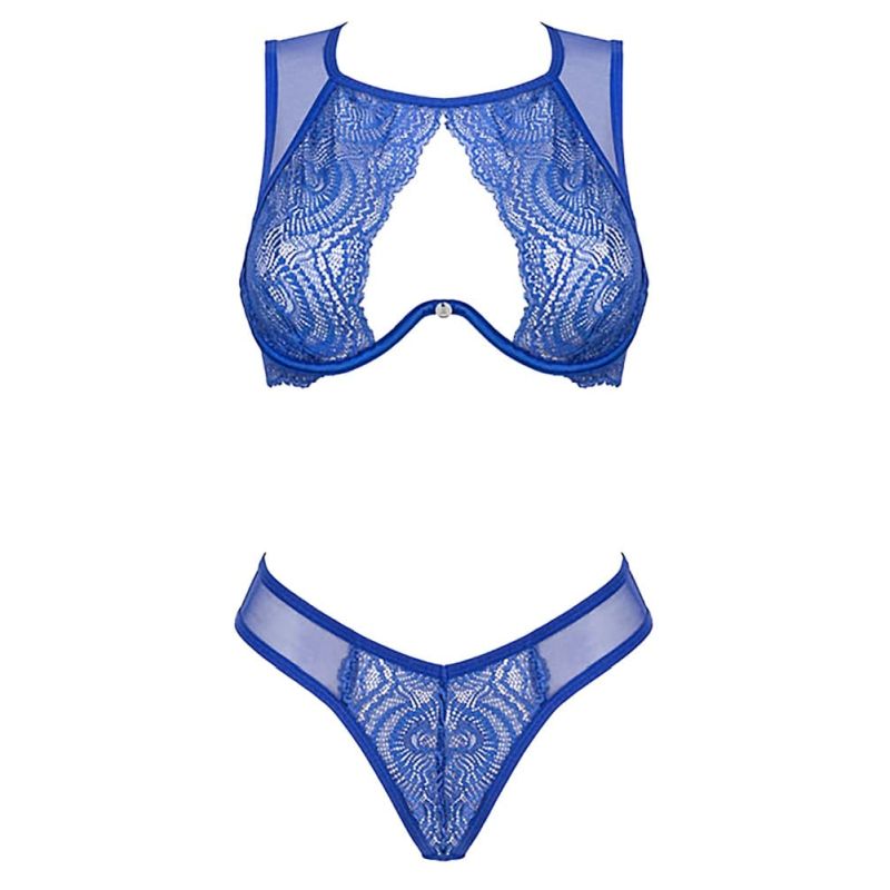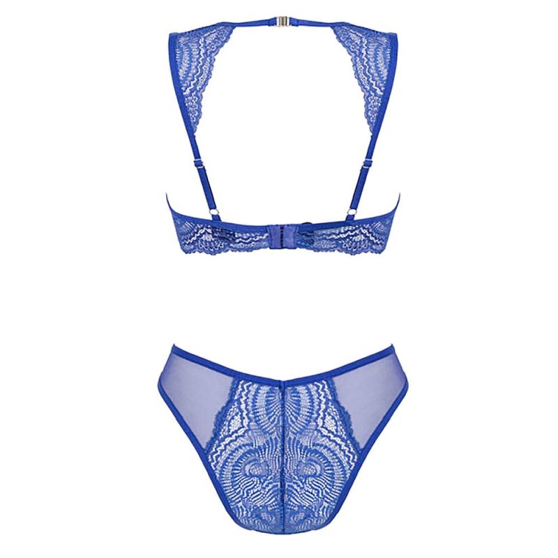 Bügel-BH und Slip im Set Giselia von Obsessive aus feiner royalblauer Spitze im Mix mit zartem Powernet. Weich und elastisch für höchsten Tragekomfort. Stylischer BH mit Cupbügeln für perfekten Halt, die Träger sind passend verstellbar. Im Nacken und im Rücken mit Clipverschluss. Der dazu passende Slip punktet mit seinem raffinierten Schnitt, der Beine und Po aufregend betont.