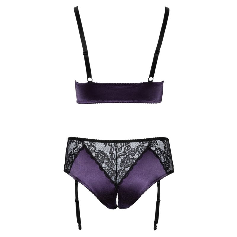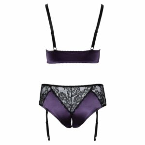 Bralette und Straps-Slip ouvert im Set von Cottelli CURVES im edlen Mix aus lilafarbenen Satin und schwarzer feiner Spitze. Das Bralette punktet mit seinen gekreuzten Stretchbändern im Dekolleté, der Taillen-Slip mit seiner einladenden Öffnung im Schritt. Die elastischen breiten Träger sind verstellbar, genauso wie die Strumpfhalter, die vom Slip auch komplett abnehmbar sind.