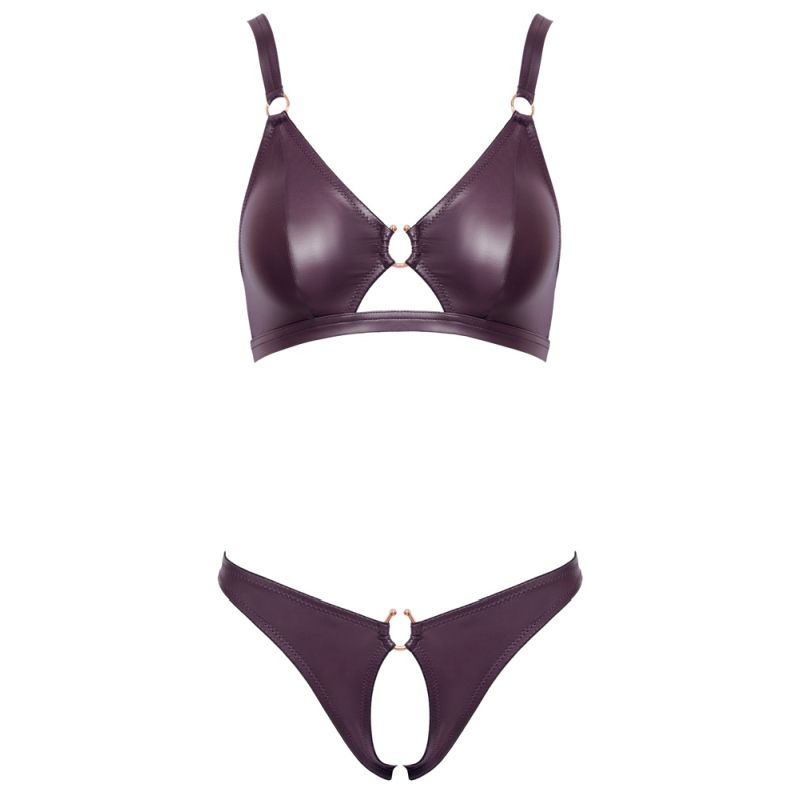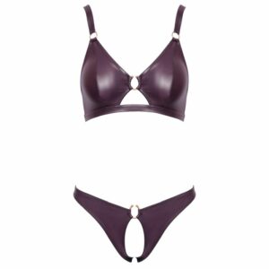 Softer BH und Slip ouvert im Set von Cottelli LINGERIE. Beides im lilafarbenen Wetlook – weich und elastisch für höchsten Tragekomfort. Raffinierte Schnittführung mit edlen roségoldfarbenen Ring-Accessoires. BH im Rücken mit verstellbarem Hakenverschluss. Auch die Träger sind für optimale Passform verstellbar. Der verführerische Slip ist im Schritt komplett offen.