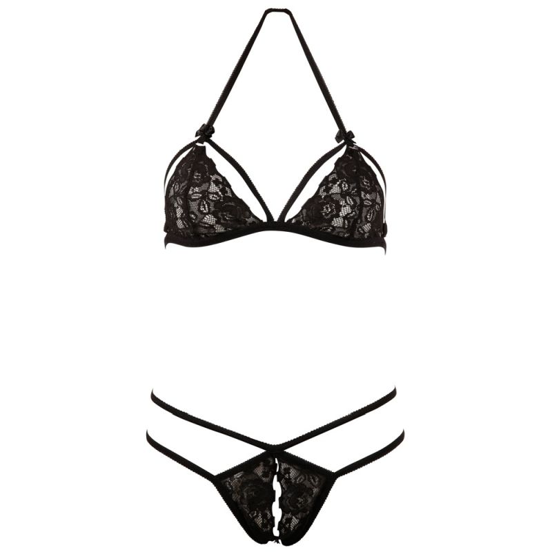 Dieses sinnliche Set lässt keine Wünsche mehr offen: Zarter Soft-BH aus Blütenspitze mit Neckholder, Riemchen-Details und Cups zum Aufklappen. Der passende String ouvert ist mit zusätzlichen Bändchen versehen, was für einen atemberaubend sexy Look sorgt.