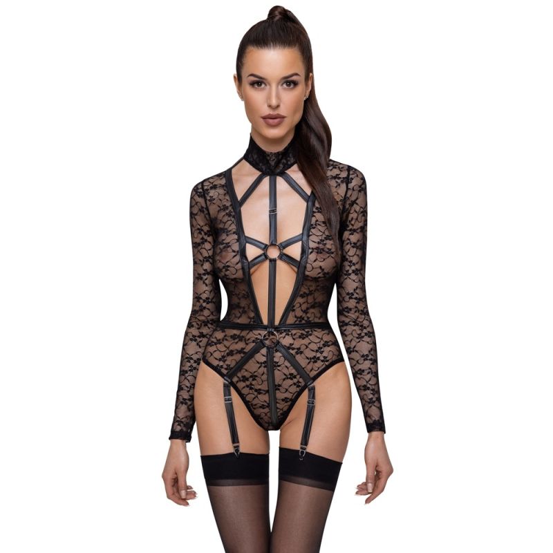 Langarm-Riobody von Cottelli LINGERIE komplett aus feiner weicher Spitze mit raffinierten Details im Mattlook. Rundum elastisch und soft anschmiegsam für hautnahen Sitz mit höchsten Tragekomfort. Vorne bis zum Bauchnabel tief ausgeschnitten und in provokanter Harness-Optik mit Stretchbändern und Ringen. Auch im großzügigen Rückenausschnitt halten dekorative Stretchbänder alles schön zusammen. Der hohe Spitzenkragen wird im Nacken mit 2 Knöpfen geschlossen. Im Schritt mit Druckknopfverschluss. Die Strumpfhalter sind verstell- und auch komplett abnehmbar.