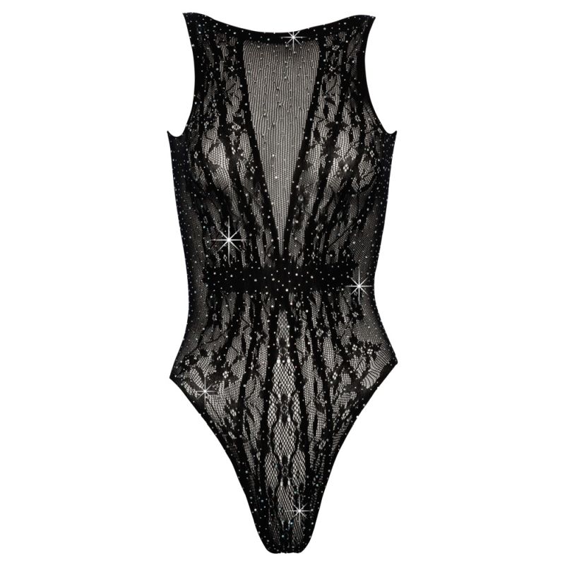 Body von Cottelli FANTASY aus feinem weichem, semi-transparentem Stretchmaterial – über und über mit verschieden großen Strass-Steinchen besetzt. Vorne mit eingewebter Rankenoptik. Im oberen Rücken schöner Cut-out. Alles nahtlos ohne prägnante Säume gefertigt und elastisch anschmiegsam für hohen Tragekomfort.