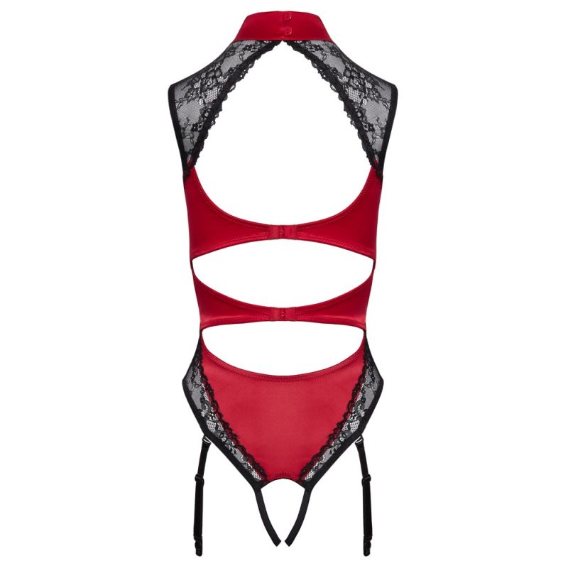 Aufsehenerregender Straps-Body von Cottelli LINGERIE aus edlem rotem Satin mit Einsätzen aus feiner schwarzer Spitze. Rundum weich und elastisch für höchsten Tragekomfort. Raffinierte Schnittführung mit Satin-Halsband zum Knöpfen, schulterbedeckender Spitze und schönem großen Dekolleté-Ausschnitt. Im nahezu freien Rücken mit zwei verstellbaren Hakenverschlüssen. Durch den offenen Schritt führen zwei Stretchriemen. Die Strumpfhalter sind passend verstellbar und auch komplett abnehmbar.