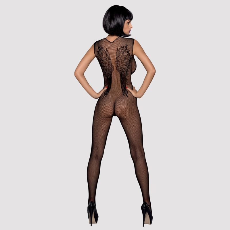Schwarzer Catsuit ouvert N112 von Obsessive aus Netz mit eingewebten Flügel-Motiven. Rundum weich und elastisch für hohen Tragekomfort. Vorne tief ausgeschnitten, im Schritt verführerisch offen. Mit Fuß.