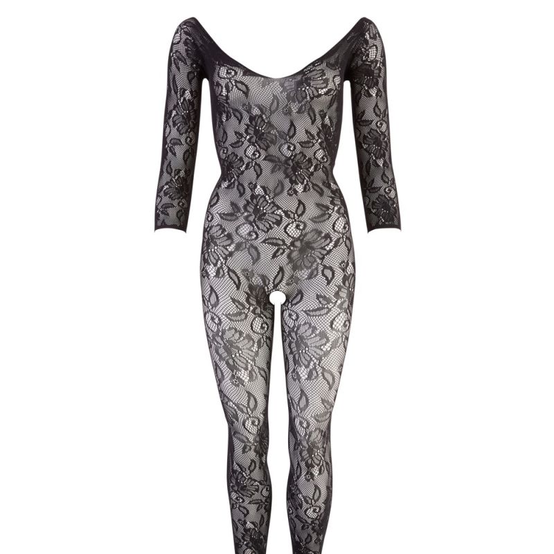 Wunderschöner Catsuit in schwarzer Blütenspitze-Optik mit 3/4-Arm, langem Bein und Fuß. Hinten mit eingewebter Schnürung. Im Schritt offen. Nahtlos gefertigt. 90% Polyamid, 10% Elasthan.