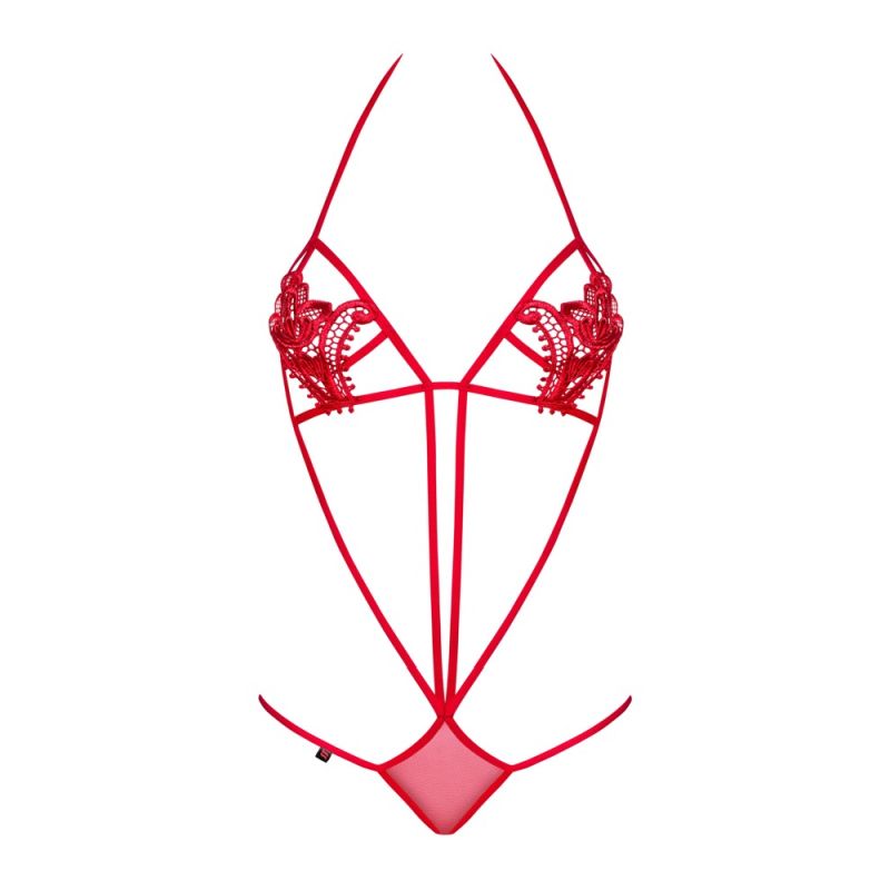 Der Stringbody Luiza von Obsessive verführt mit seiner Offenherzigkeit, die nicht viel Platz für Fantasie lassen. Über den Nippeln liegen zarte florale Stickereien – ein Eyecatcher für Brust-Liebhaber:innen. Im Nacken und Rücken zu knoten lässt er sich bequem anziehen.