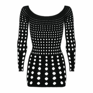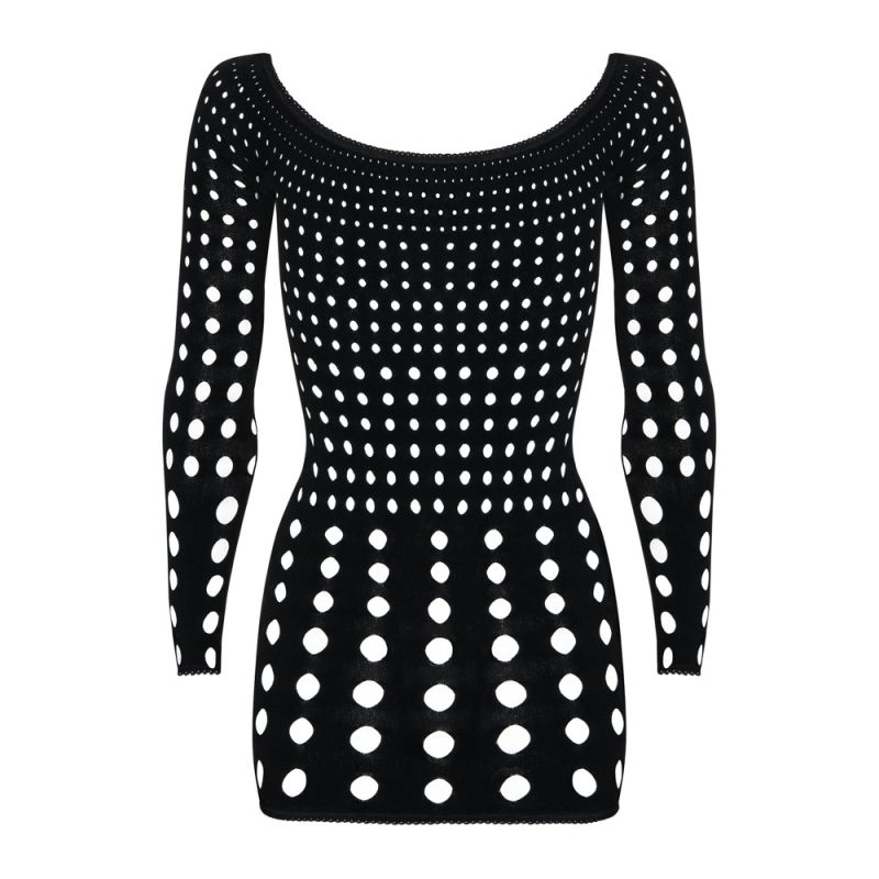 Kurzes enges schwarzes Kleid Rocker von Obsessive mit langem Arm. Rundum in extravaganter Loch-Optik. Anschmiegsam weich und elastisch für hohen Tragekomfort.