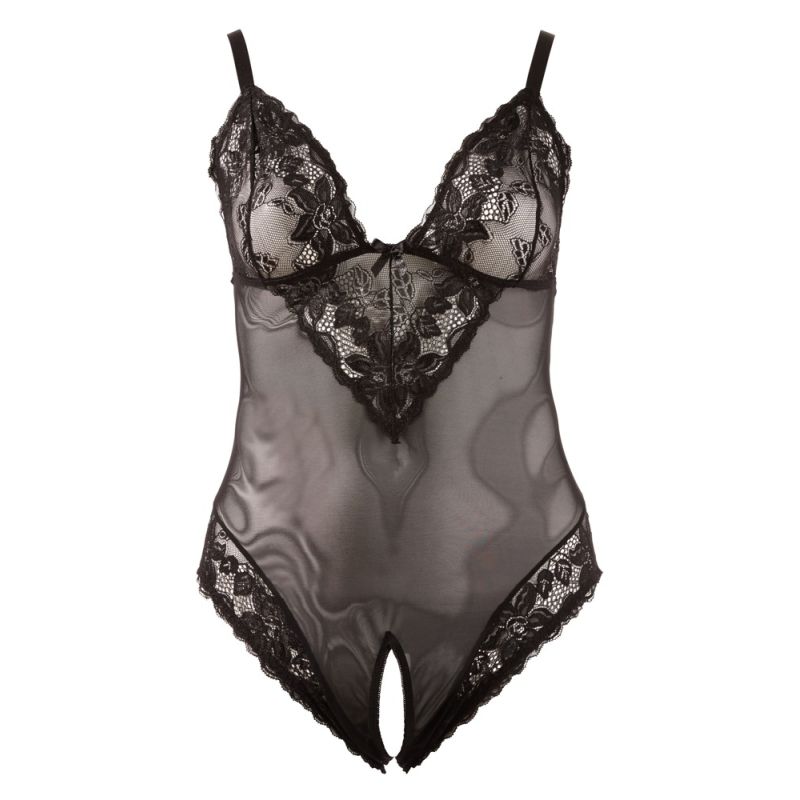 Edler Body ouvert aus semitransparentem Powernet mit verstellbaren Trägern. Mit zarter Blütenspitze an den Cups, die in Richtung Körpermitte spitz ausläuft. Die Beinabschüsse vorne und hinten sind ebenfalls mit Blütenspitze verziert.