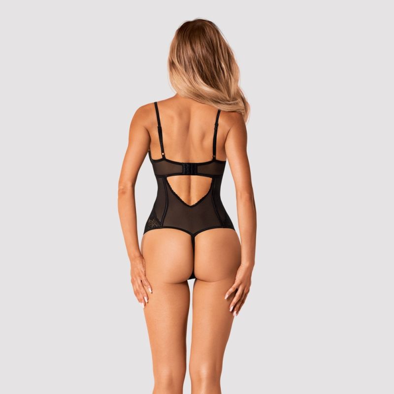 Schwarz-transparenter, knapp geschnittener Body ouvert Serena Love von Obsessive aus zartem Stretchtüll. Vertikale Streifen für einen schlanken Look. Mit kleinem Schmuckelement zwischen den Bügel-Cups aus feiner Blütenspitze. Auch an den Beinausschnitten ist der Body mit Blütenspitze verziert. Alles weich und elastisch für vollen Tragekomfort. Die Träger und der verstellbare Hakenverschluss im tiefen Rückenausschnitt sind für perfekten Sitz verstellbar. Auch die zwei Stringriemchen im verführerisch offenen Schritt lassen sich passend verstellen.
