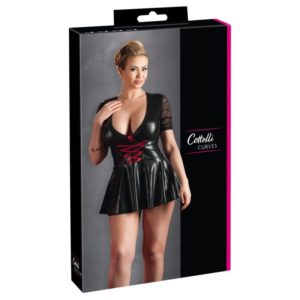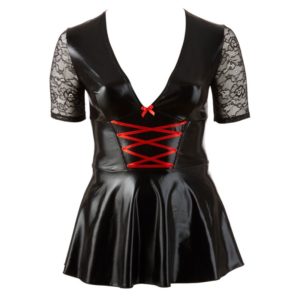 Minikleid mit roter Schnürung am tiefem Dekolleté, kurzem Spitzen-Arm und ausgestelltem Rockteil. Rücken mit Spitzeneinsatz.