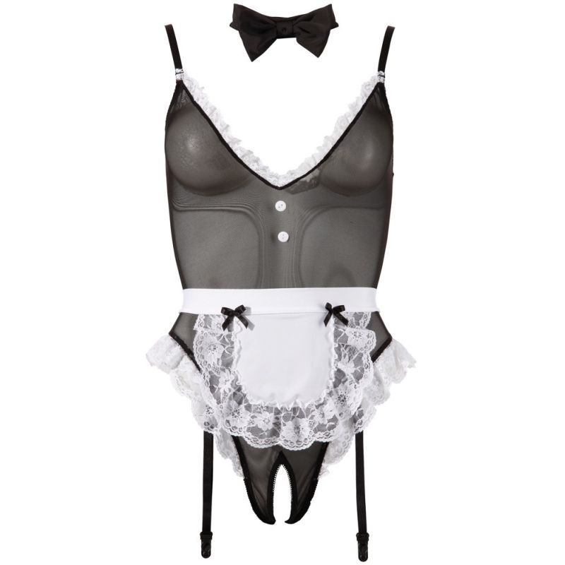 Body aus Powernet mit Spitzenverzierung. Mit verstellbaren Trägern und verstell- und abnehmbaren Strapshaltern. Im Schritt offen. Inklusive Halsband mit Fliege und Klettverschluss sowie Schürze zum Binden.