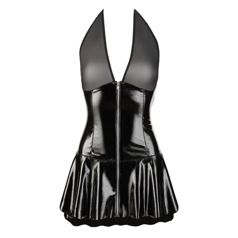 Kurzes Kleid von Black Level komplett im schwarzen Lackglanz mit Cups und Neckholder aus Powernet. In figurnaher Schnittführung mit ausgestelltem Röckchen, das hinten ein bisschen länger gearbeitet ist als vorne. Vom tiefen Dekolleté bis zum Saum führt vorne ein durchgehender Reißverschluss.