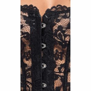 Kurzes trägerloses Corsagen-Kleid von Noir aus zarter Spitze (Oberteil) im Mix mit Powerwetlook (Rockteil). Rundum weich und elastisch für maximalen Tragekomfort. Hautnahes Corsagen-Oberteil mit eingearbeiteten Formstäben und Hakenverschlussleiste vorne. Edel matt glänzender Rockteil schwingend ausgestellt.