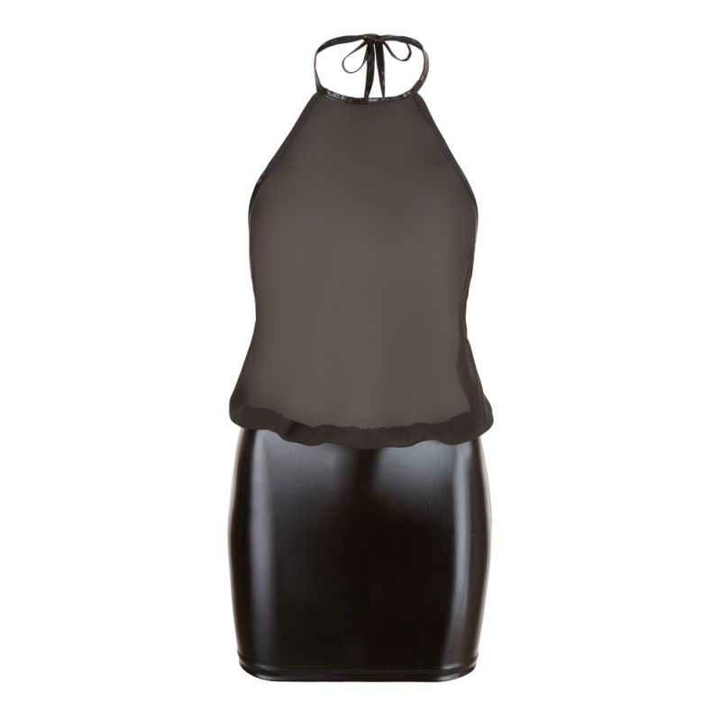 Dieses schwarze Minikleid mit Neckholder zum Binden ist vorne hochgeschlossen, hinten verzaubert es aber mit freiem Rücken. Das Rockteil aus glänzendem Wetlook liegt eng an, während das transparente Chiffon-Oberteil etwas weiter geschnitten ist. Welch reizvoller Kontrast!