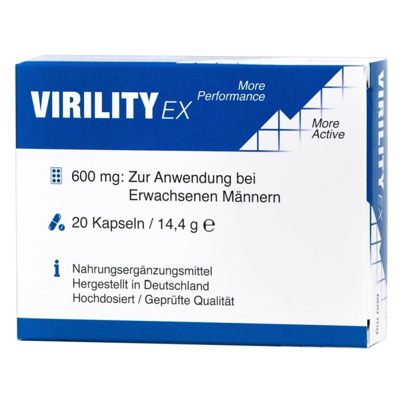 Veganes Nahrungsergänzungsmittel Virility Ex speziell für den Mann mit einer natürlichen Alternative aus ausgewählten Extrakten in einer komplexen Formel. Eine Kapsel enthält 600 mg Extraktmischung aus 6 Zutaten: