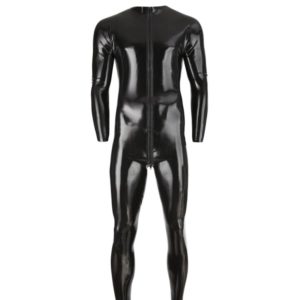 Hochgeschlossene Verführung, die mit Reißverschluss bis über den Po – von beiden Seiten zu öffnen ist. Fuß mit ausgeformter Ferse. Schwarz. Latex, hergestellt unter der Verwendung von Naturkautschuklatex, der Allergien verursachen kann.