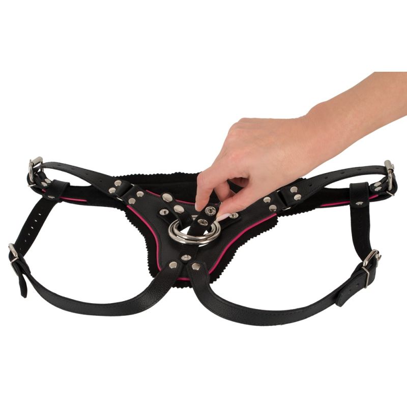Schwarzer, leicht gepolsterter Strap-On-Harness für Frauen. Größenverstellbar an der Hüfte und am Gesäß. Verschiedene Dildos können mithilfe der zwei verschieden großen Ringe befestigt werden. Außen mit Glattleder und innen mit Rauleder verarbeitet. Mit schelmisch überstehender Zick-Zack-Kante im Trachtenlook und pinkfarbener Paspel.