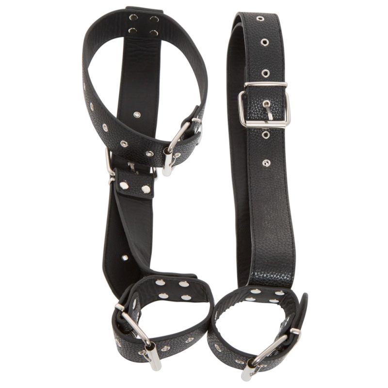 Robuste Konstruktion aus Hals- und Taillenriemen mit stabil angenietetem Rückenriemen, an dem übereinander die Fesseln für die rechte und die linke Hand angebracht sind. Alle Riemen sind per Schnallen mehrfach verstellbar. Schwarzes Lederimitat.