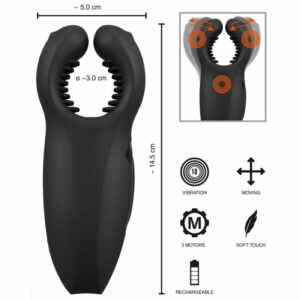 Insgesamt 3 leistungsstarke leise Motoren sitzen in der Basis und in den beiden genoppten Vibro-Flügeln. Zuverlässige Power für die zupackenden Hin-und-her-Bewegungen der Flügel (Moving) und die Vibrationen. Beide Funktionen sind in jeweils 10 Modi direkt am Toy bequem steuerbar. Getrennt oder aufregend miteinander kombiniert.
