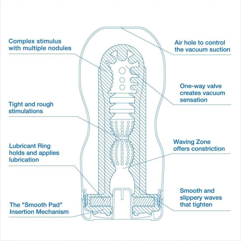 Die abwechslungsreiche Innenstruktur mit unterschiedlichen Durchmessern massiert den Penis intensiv. Und am Ende des Masturbators sorgt die innovative Vakkumöffnung für saugende Feelings wie beim besten Blowjob. Dazu wird der Aufkleber von der Vakuumöffnung entfernt und diese mit dem Finger (ganz nach Wunsch) verschlossen oder geöffnet.