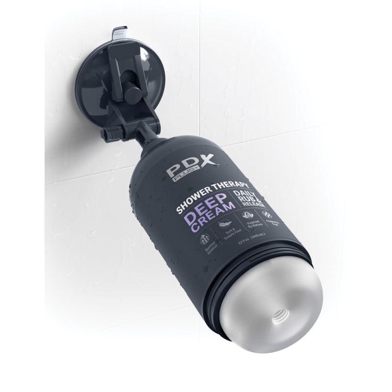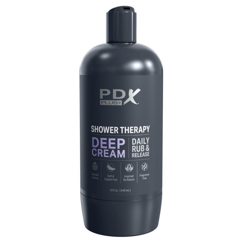 Der Masturbator Shower Therapy Deep Cream von PDX Plus sieht von außen aus wie eine neutrale Shampooflasche. Doch schraubt man die Bodenkappe ab, steckt innen ein enger Lusttunnel mit aufregender Noppenstruktur für die intensive Penismassage beim Handjob. Der Flaschen-Klappverschluss fungiert als Saugkontrolle, um durch einfaches Öffnen und Schließen die saugenden Blowjob-Feelings zu steuern.