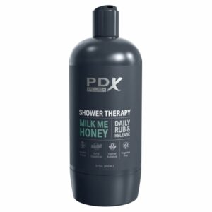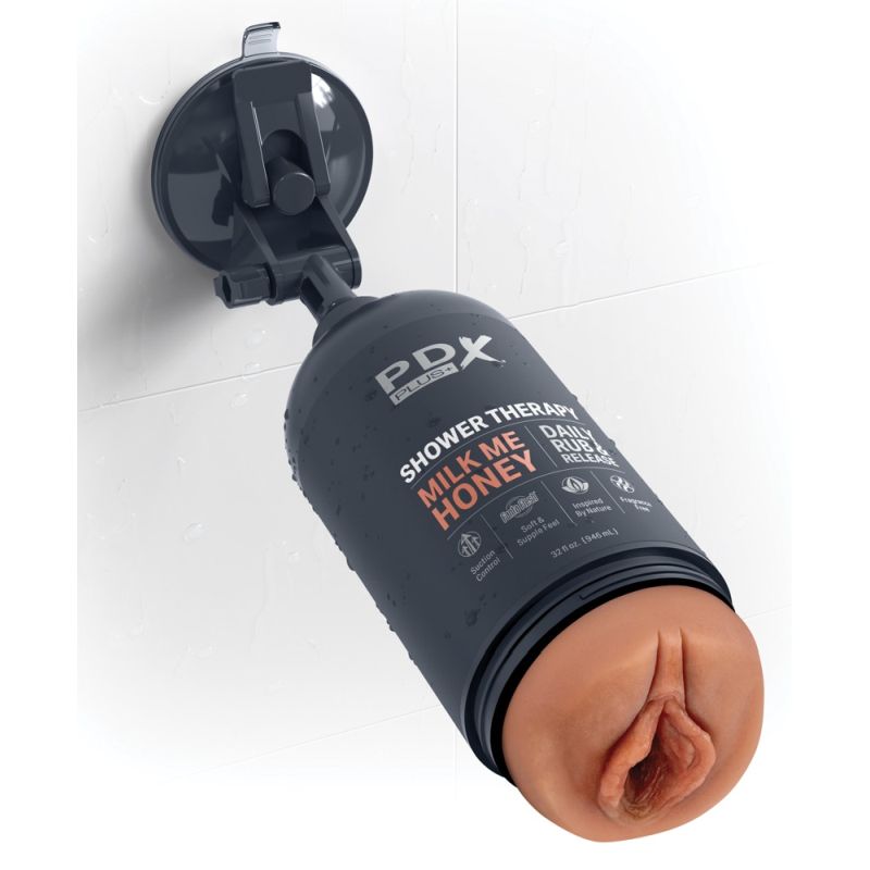 Der Masturbator Shower Therapy Milk Me Honey von PDX Plus sieht von außen aus wie eine neutrale Shampooflasche. Doch schraubt man die Bodenkappe ab, steckt innen eine lebensecht nachgeformte Vulva und Vagina mit aufregender Noppenstruktur für die intensive Penismassage beim Handjob. Der Flaschen-Klappverschluss fungiert als Saugkontrolle, um durch einfaches Öffnen und Schließen die saugenden Blowjob-Feelings zu steuern.
