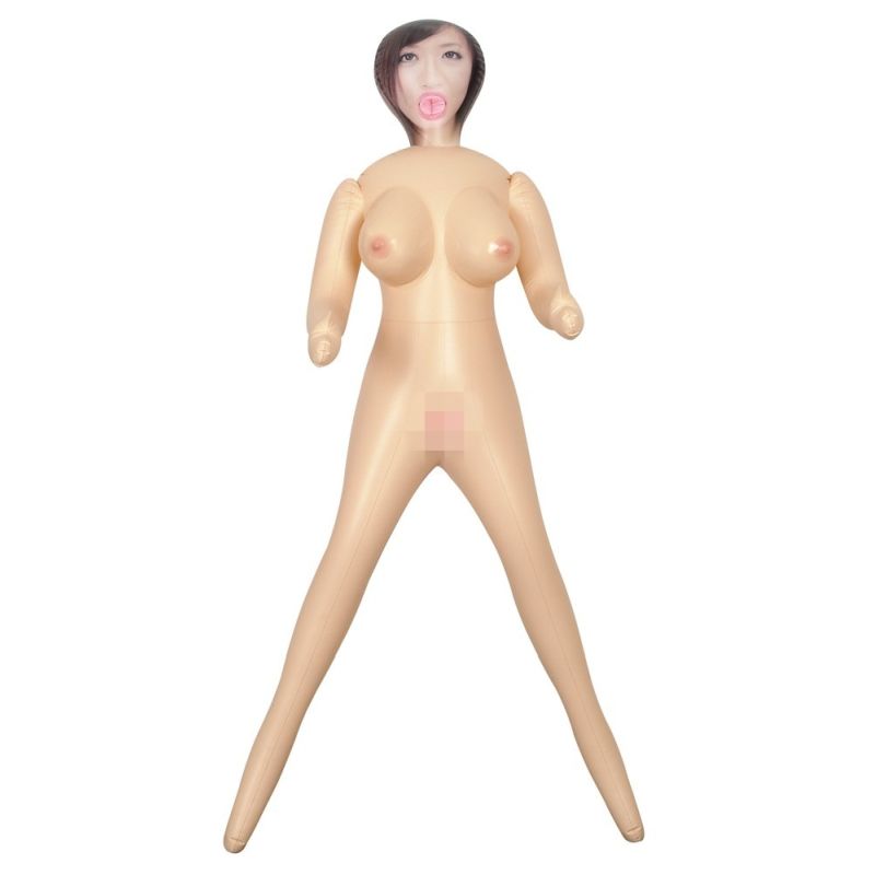 Liebespuppe mit drei engen Lustöffnungen und aufgedrucktem Gesicht sowie Haaren. Die Liebespuppe befindet sich in einer einladenden Umarmungsposition und lädt zu mehr als nur Kuscheln ein. Sie ist auch eine gute Begleiterin zum Junggesellenabschied.