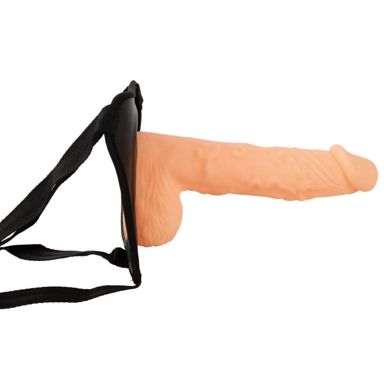 Hohler Naturdildo fest platziert an größenverstellbarem, elastischem Umschnallgurt. Steifer harter Dildo mit ausgeprägter Äderung und Eichel, die deutlich spürbar sind und intensiv massieren und stimulieren. Trägt ER (auch ohne Erektion!) für mehr Länge und Umfang sowie Steife und Stärke – sogar seine Hoden finden in dem hohlen Dildo Platz. Kann auch SIE tragen für Pegging und lesbische Stoßfreuden.