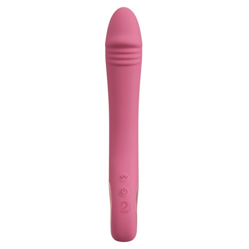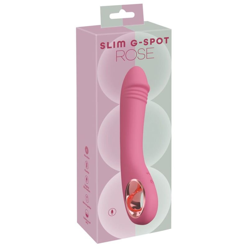 Eleganter handlicher Vibrator Slim G-Spot Rose von You2Toys für intensive Vagina-Massagen mit gezielter G-Zonen-Stimulation – allein oder zu zweit. Ideal gebogen und mit stilisierter strukturierter Eichel ausgestattet, verwöhnt er tiefgehend und G-punktgenau. Dabei verwöhnen 10 leise Vibrationsmodi von sanft bis intensiv. Bequem per Knopfdruck steuerbar am praktischen Ring-Griff, der auch sicheren Halt und komfortables Spiel gewährleistet. Sogar in Bad und Dusche, denn der Slim G-Spot Rose ist wasserdicht.