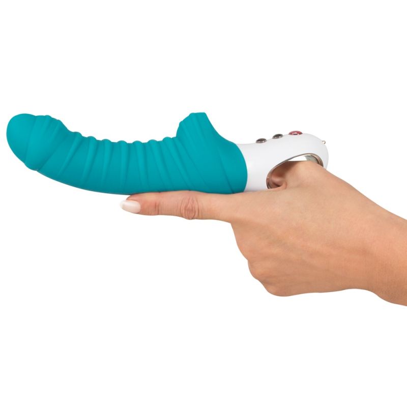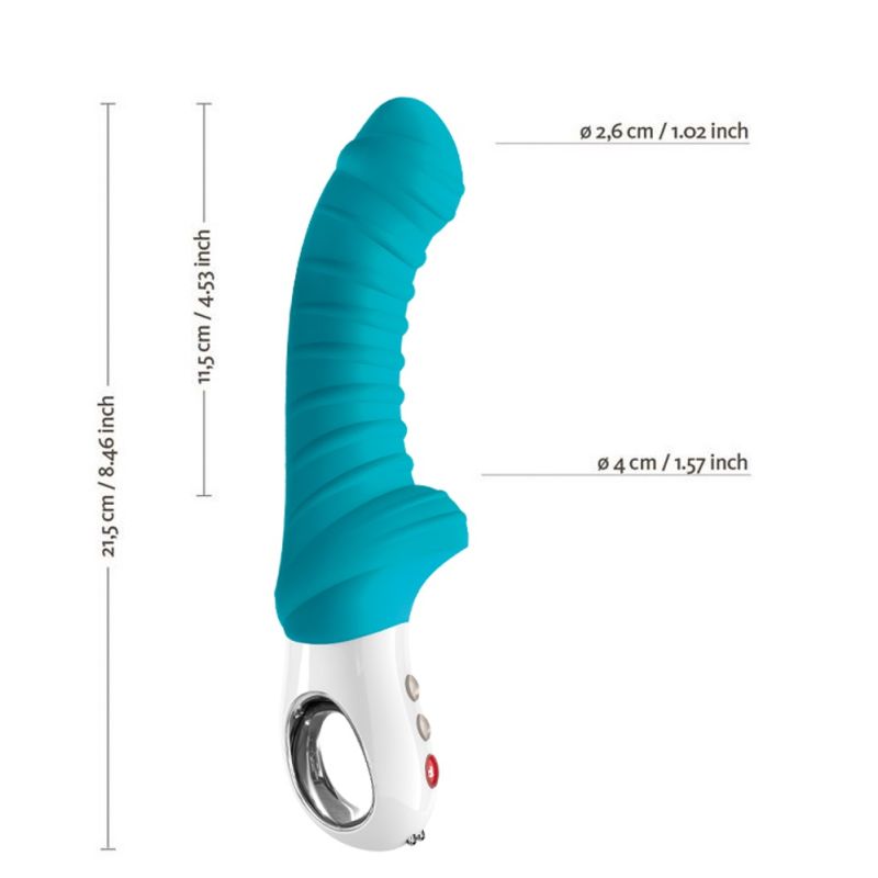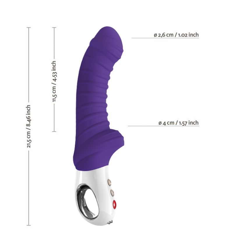Angenehm biegsamer G-Punkt-Vibrator mit sinnlich gerilltem Schaft und praller Eichel. Ergonomisch gebogen für eine punktgenaue Stimulation. Die massive Basis massiert dazu kraftvoll die Klitoris. TIGER G5 eignet sich auch hervorragend zur Stimulation von Prostata und Perineum. Dazu sorgen 6 tieffrequente Vibrationsmodi in jeweils 6 Intensitäten für ein abwechslungsreiches Liebesspiel. Mit seidig zarter Textur und praktischer Ringhalterung. Wiederaufladbar mit dem beiliegenden Magnetic-Charger-Kabel.